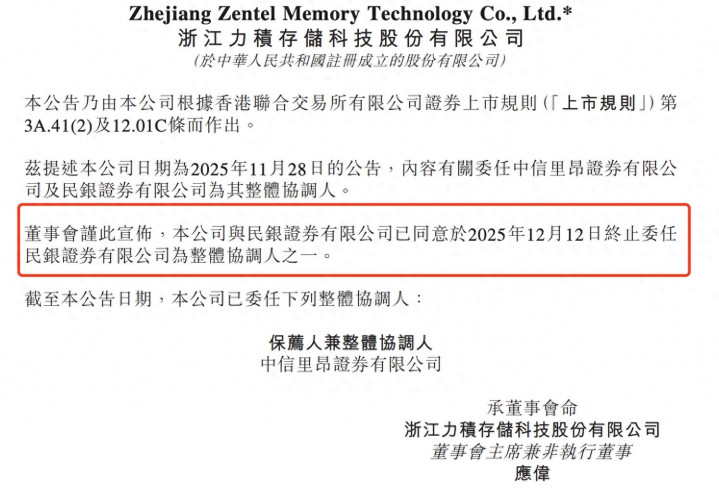 随后,12月12日,力积存储发布整体协调人退任公告,表示公司和民银证券已同意于当日终止委任民银证券为整体协调人之一。此外,中信里昂仍担任其保荐人兼整体协调人。